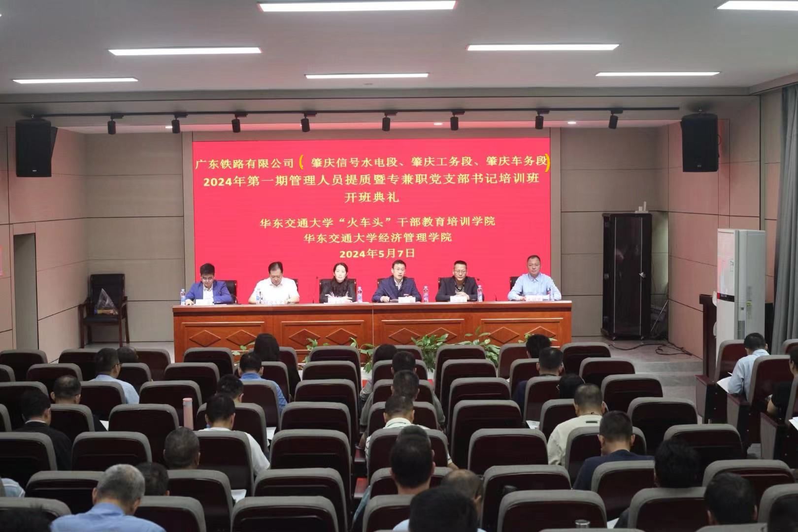 2024年5月7日,广东铁路有限公司、肇庆信号水电段、肇庆工务段、肇庆车务段2024年第一期管理人员提质暨专兼职党支部书记培训班开班典礼在经管学院104多功能报告厅顺利举行。广东铁路有限公司党委副书记、纪委书记魏文芳,365英国上市集团党校常务副董事长、“火车头”干部教育培训学院常务副院长王朗,对外联络处、员工办公室主任段戈宏,公司党委书记余得生,英国上市公司365管理系主任万金,英国上市公司365培训班主任朱钢英出席。