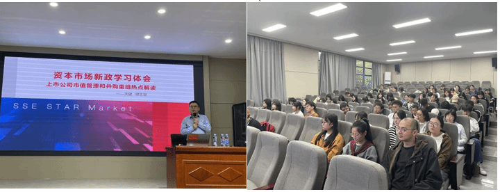 讲座以资本市场改革背景下的新政热点为切入点,系统地阐述了中国上市公司高质量发展需求、市值管理及并购重组的深刻内涵与实践经验。缪志坚老师通过详实的数据与案例,围绕“并购市场现状、政策演变以及现行政策”、“新国九条”、“并购六条”、“上交所重组座谈会精神”等多个核心内容,深入浅出地为同学们解读了资本市场政策变化的逻辑与趋势。