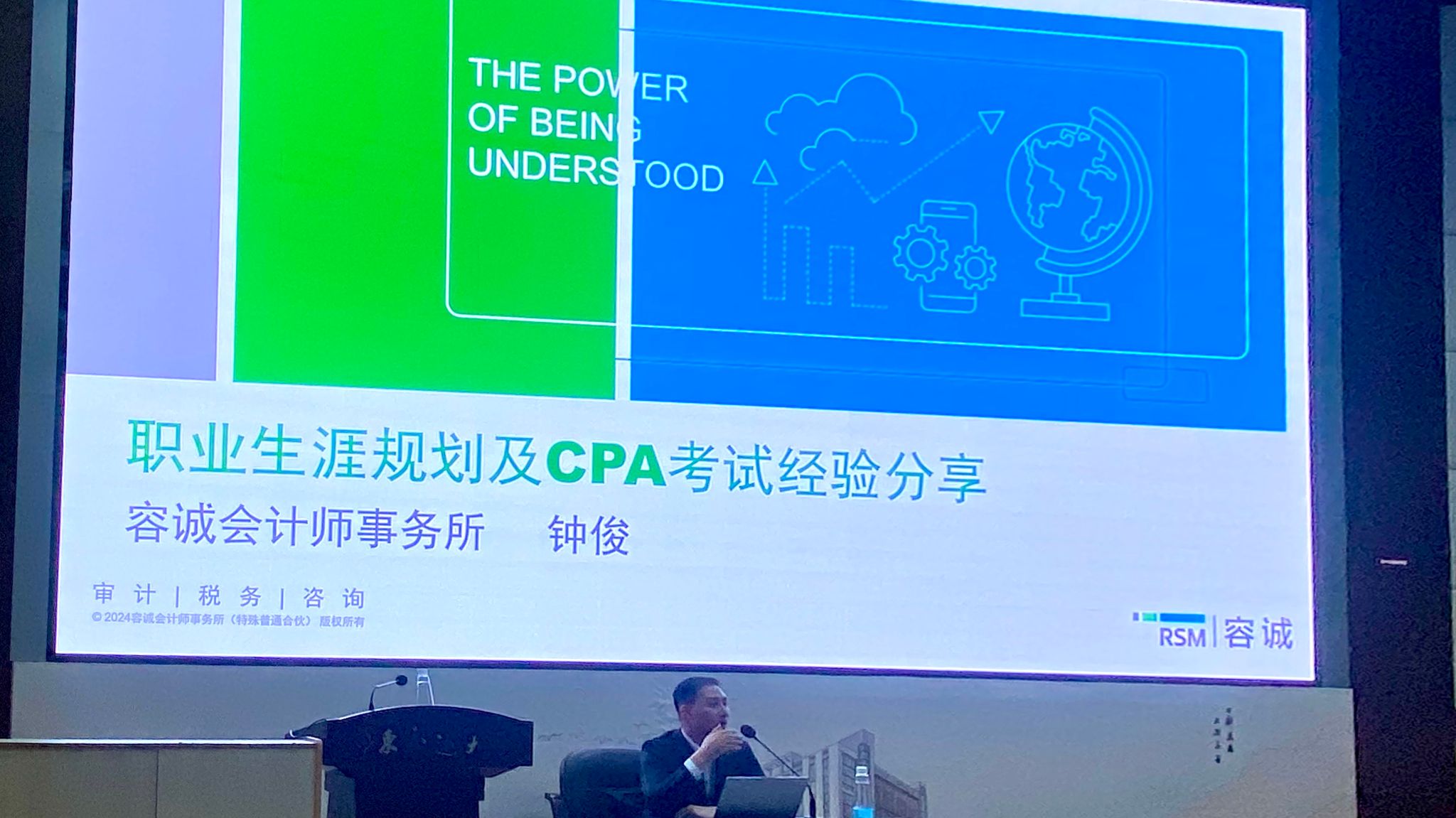 2024年11月6日晚19:00,经管学院于南区202报告厅成功举办了一场以《职业生涯规划及CPA考试经验分享》为主题的讲座,旨在提升同学们的职业生涯规划意识,助力其合理规划老员工活。本次讲座特邀中国注册会计师、容诚会计师事务所业务合伙人、内核委员会委员钟俊先生主讲, ACCA、国会、CMA专业全体同学参与。