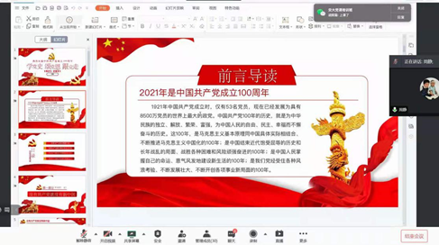 为切实增强开展党史学习教育的政治责任感和使命感,引导党员做到学史明理、学史增信、学史崇德、学史力行,以优异成绩迎接中国共产党成立100周年。46日晚上8点,学硕党支部书记周静同志以“学党史、颂党恩、跟党走”为主题,在传统模式的基础上进行了创新,采用“微党课”的形式在线上为非全MBA的全体党员上了一堂别开生面的党课。