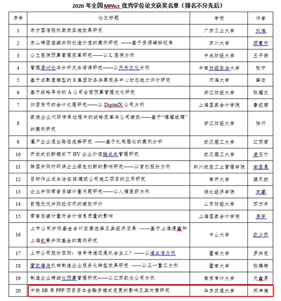 近日,全国会计专业学位研究生教育指导委员会公布了2020年全国MPAcc优秀学位论文评选结果。公司2020届全日制会计硕士毕业生邢伟健同学的毕业论文《中铁SR局PPP项目资本金融资模式变更的影响及其对策研究》(指导教师:黎毅教授)获全国优秀论文。