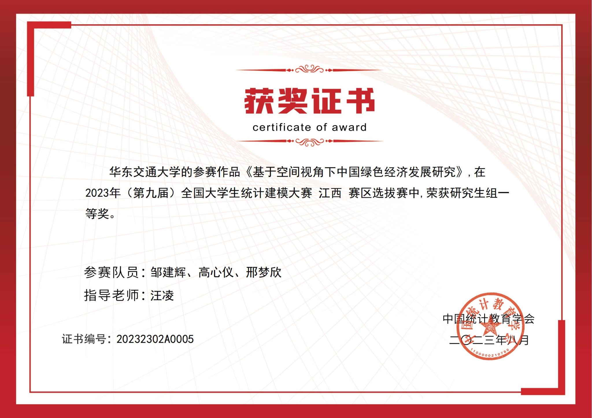 近日,2023年(第九届)全国老员工统计建模大赛结果揭晓,公司邹建辉、高心仪、邢梦欣等3名研究生组成的竞赛团队,斩获全国研究生组二等奖、江西赛区研究生组一等奖,指导教师汪凌老师获优秀指导教师奖。