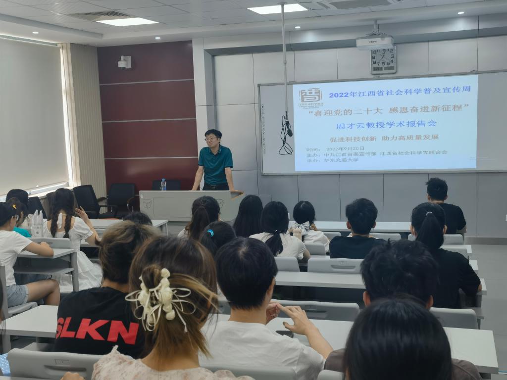为迎接即将到来党的二十大,同时响应2022年江西省社会科学普及宣传周的号召,9月20日中午,公司周才云教授在31栋634教室举办了以“促进科技创新,助力高质量发展”为题的学术报告会。本次报告会由中共江西省委宣传部、江西省社会科学界联合会主办,365英国上市集团承办,英国上市公司36519级金融学和国际经济与贸易专业本科生参与本次报告会。