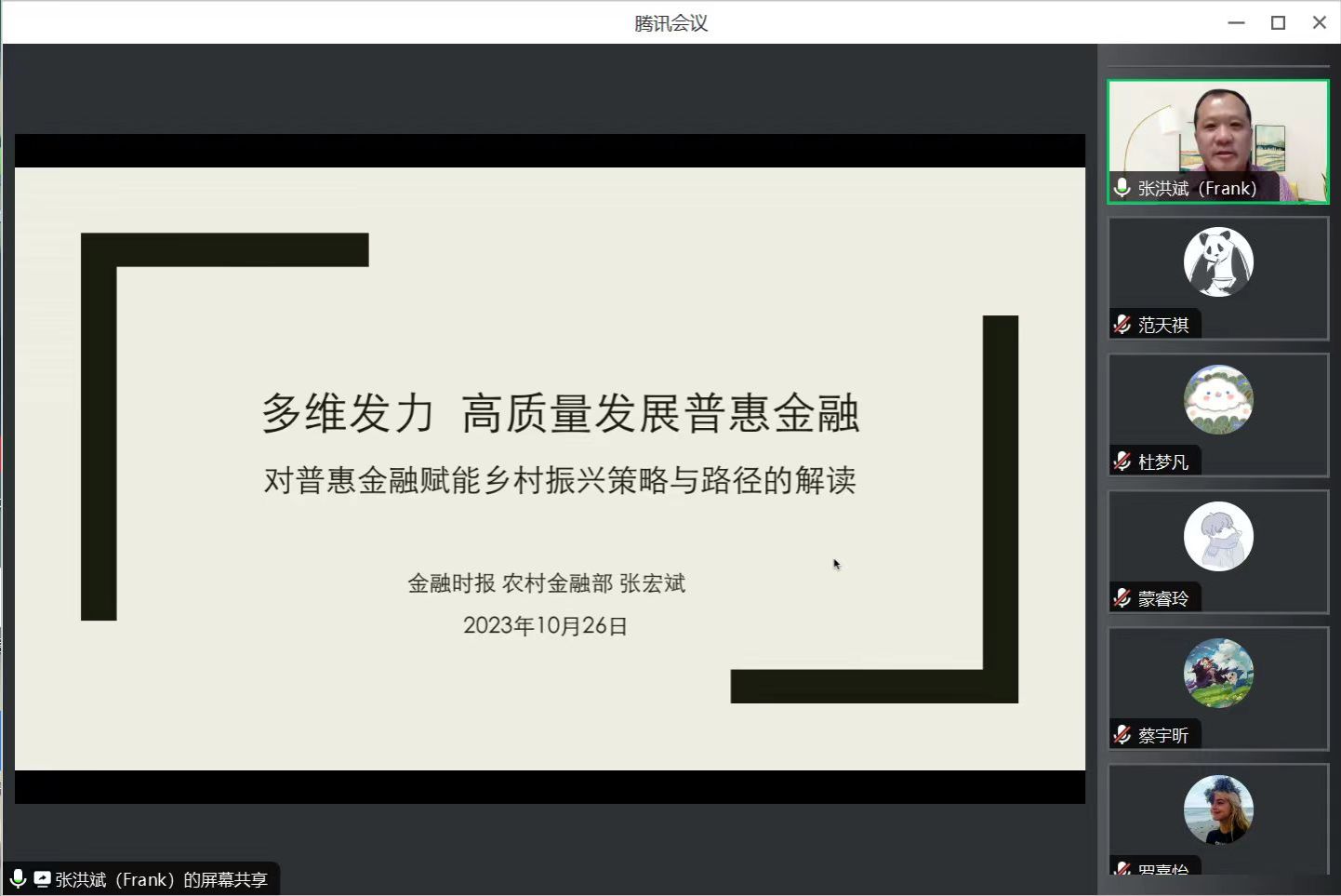 2023年10月26日晚,公司邀请《金融时报》资深记者张宏斌进行了主题为“多维发力 高质量发展普惠金融——对未来普惠金融赋能乡村振兴策略与路径的解读”的线上学术讲座,讲座由副经理周才云教授主持,经管学院70余名师生参与了本次学术讲座。