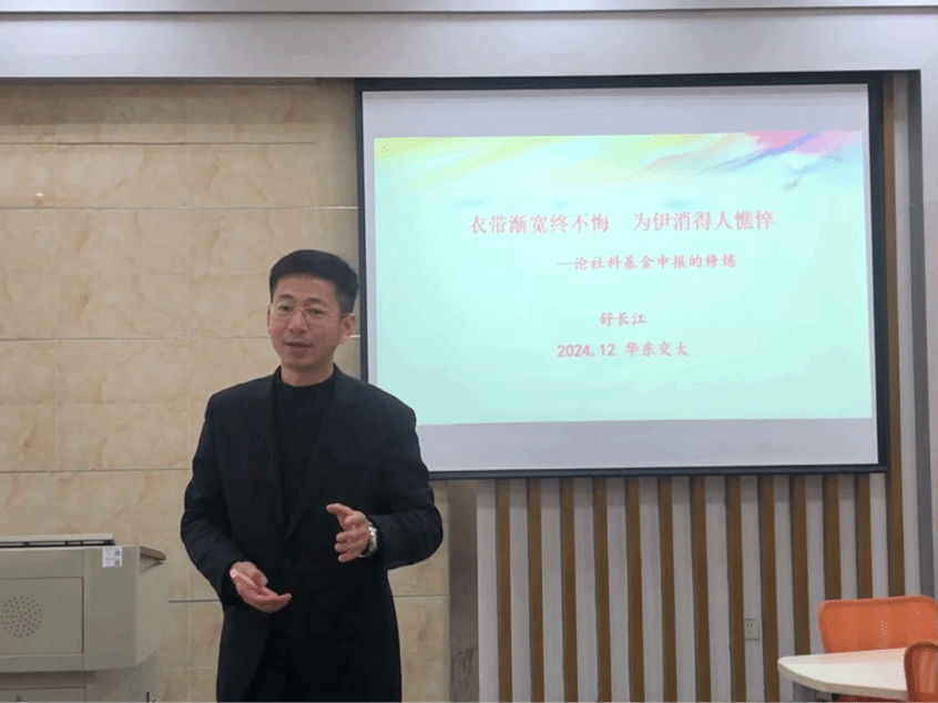会上,舒长江教授首先介绍了国家社科基金项目申报的现状。他指出,基金申报难度加大,越来越多的博士加入,竞争激烈,大家应该根据自身的学科属性找准赛道。他提倡高校教师应当积极申报项目,并说明了基金申报对高校教师,尤其是年轻教师具有重要意义。舒长江教授表示基金申报失败是常态,要在失败中积累经验,随后他指出决定基金申报的三要素为选题、内容和基础。首先是选题方面,需要仔细研究近三年立项的选题,选题要新,破题要准,信息传递要高效和直观;其次是内容方面,学术综述要有“纵横”两维度,“研究对象”要明确,“总体框架”要合理,创新点要简洁,新颖有记忆点,“基本思路、具体研究方法”中的研究方法不可多;最后是基础方面,“研究基础”的撰写要证明自己有实力、有能力,参考文献要全面、显要、规范,申报书要平衡,不能“头重脚轻”。