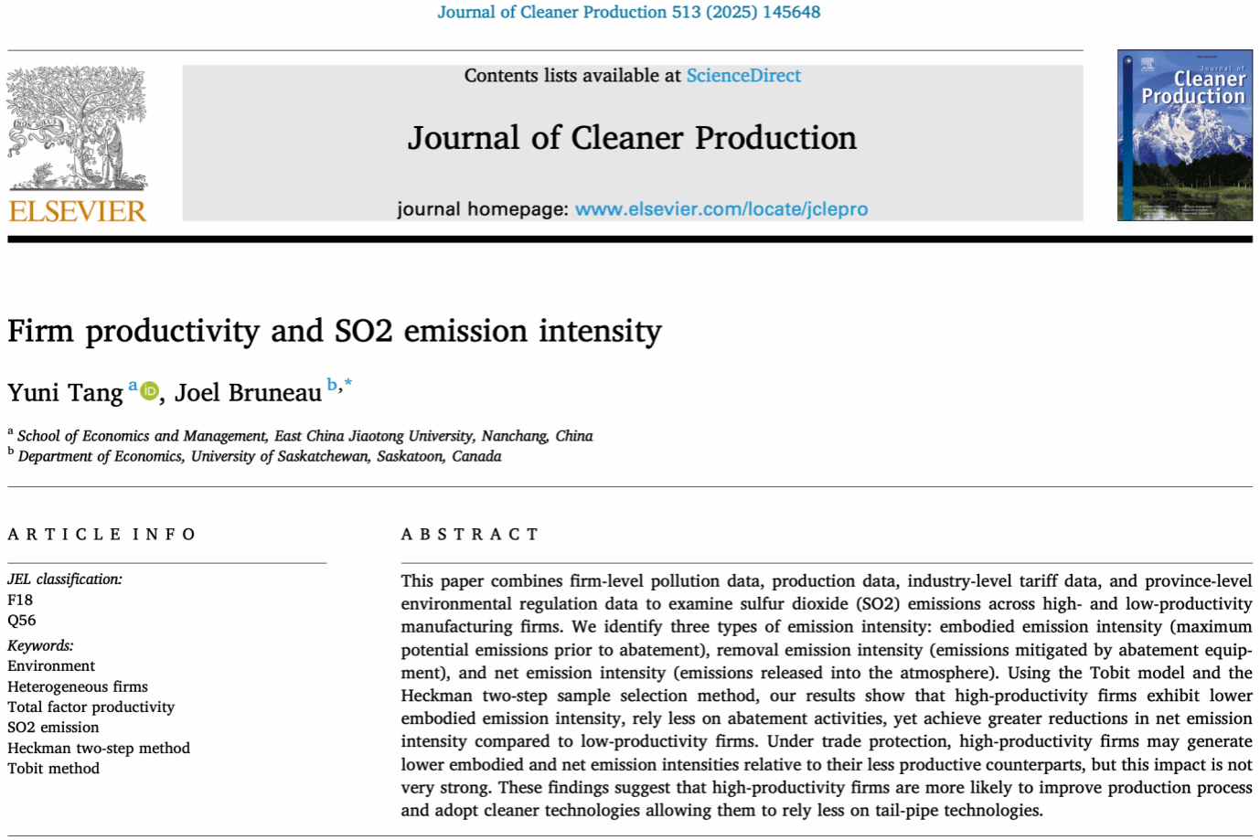 近日,公司唐雨妮老师作为第一作者在环境及可持续发展领域国际著名期刊《Journal of Cleaner Production》(中科院1区TOP期刊,IF 9.8)发表题为“Firm productivity and SO2 emission intensity”的高质量论文,特此报喜!