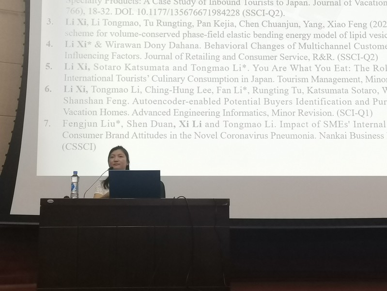 报告伊始,李希老师以提问的方式打开话题,在了解到大部分同学们有想读硕士的意愿后,她分享了自己的读书和兼职经历。随后,李希老师分别介绍了自己的两篇论文。第一篇文章通过分析大阪留学的实践数据,发现国家间距离对购买力产生影响。第二篇文章是从“Research Background-Literature Review & Hypothesis Development-Research Methodology-Results-Discussion and Conclusion”的模式来展开研究。李希老师认为,学术研究并不是一劳永逸,整个研究过程就是要加强创新。最后,李希老师和同学们进行了广泛交流。