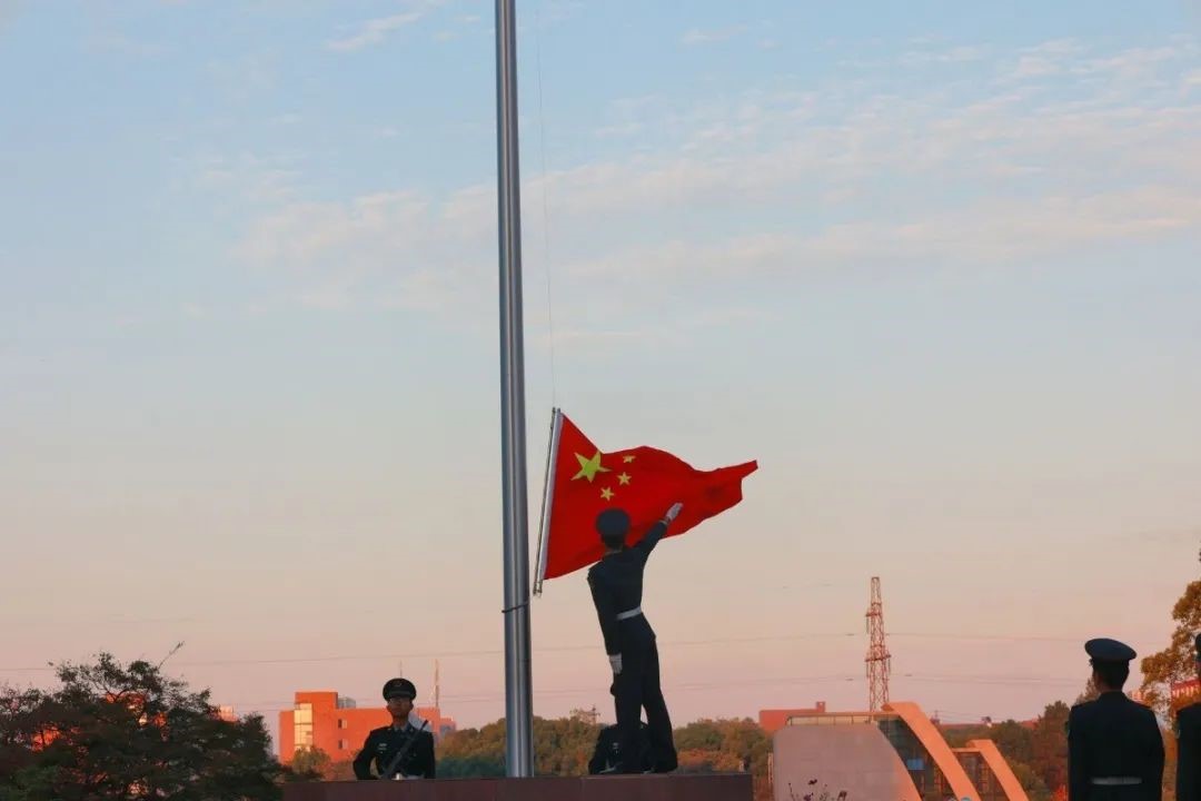 伴随着朝阳,全体人员齐唱国歌,向冉冉升起的五星红旗行注目礼。
