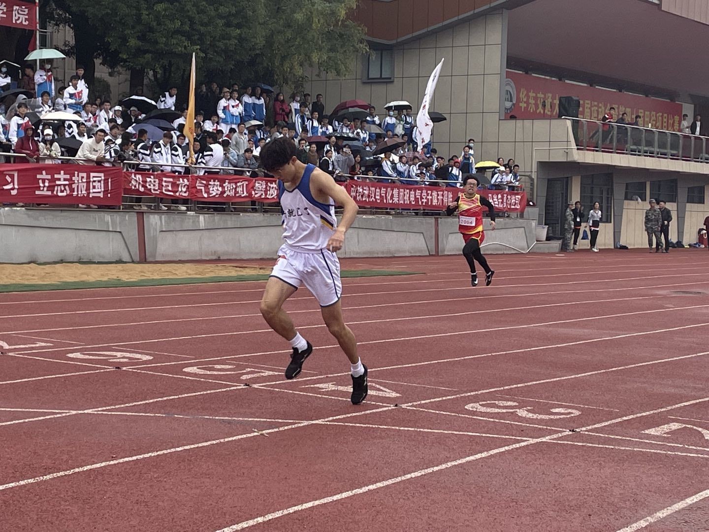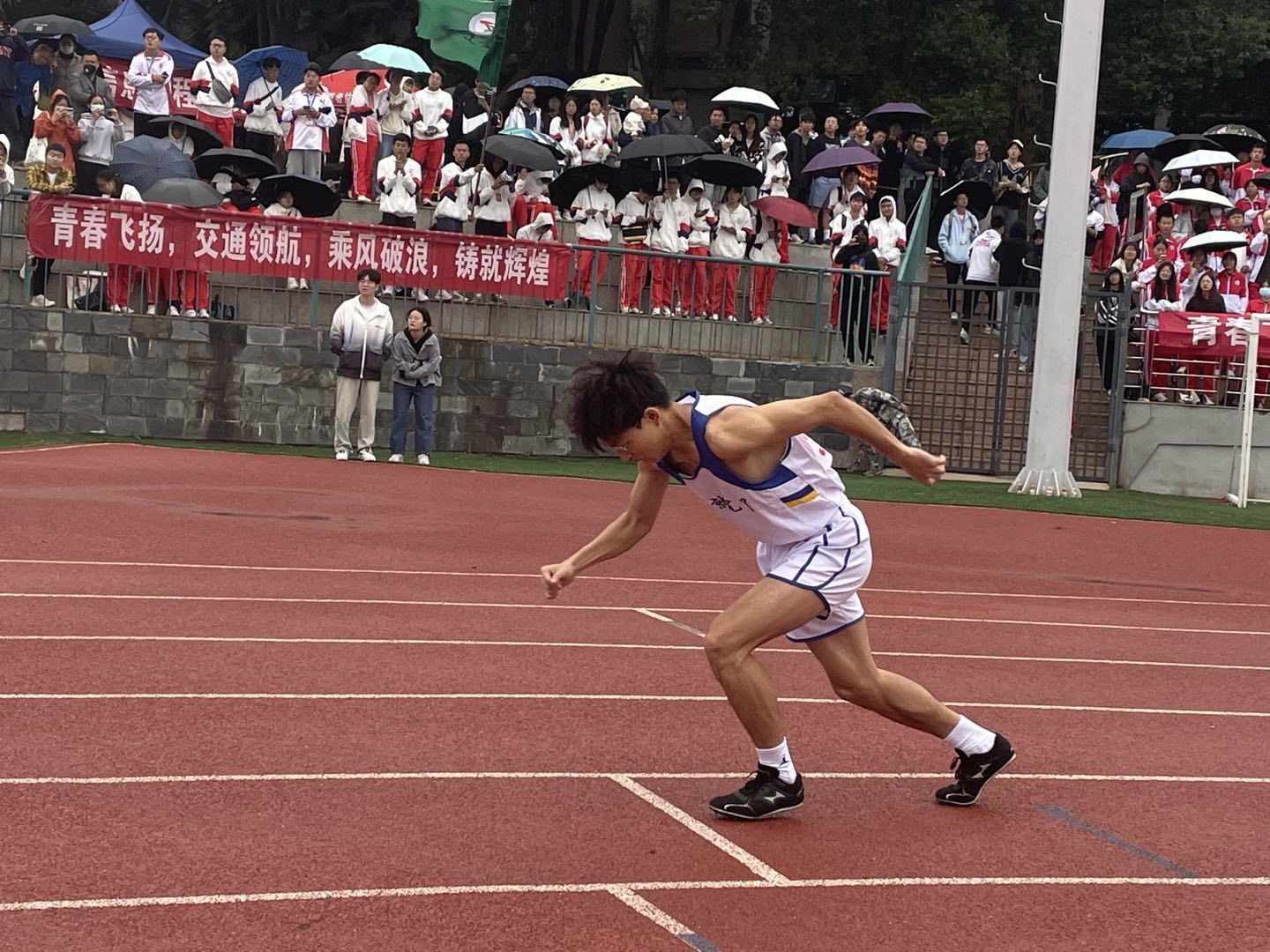 飒爽的秋风,飘然而至。绿茵的草地旁,红色的橡胶跑道上,随着一道枪声响起,彭安圣如离弦的箭般向着终点冲去,在赛场上留下一道潇洒的身影,振奋人心的同时也让人感受到了经管运动健儿们挑战自我、勇往直前的精神。此刻的观众席上,拉拉队正为运动健儿们加油助威,热情高涨。彭安圣同学冲向终点线的那一刻,无数人起身为他欢呼呐喊。少年们的笑声、欢呼声、呐喊声在操场上回荡着、盘旋着,处处洋溢着青春的气息。