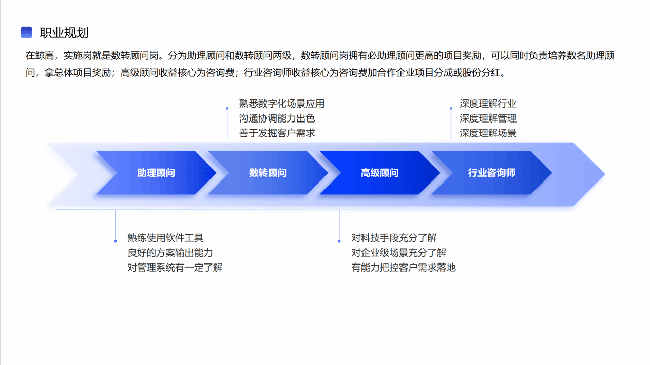 在员工职业规划方面,鲸高科技介绍了了他们的职业发展“路线图”!公司的数转顾问岗位体系层次分明,从助理顾问起步,一路进阶至数转顾问,每一步都充满机遇与挑战。数转顾问岗不仅拥有更高的项目奖励,还可培养数名助理顾问并获得总体项目奖励;进阶为高级顾问,将以专业咨询费作为核心收益,让专业能力得以“变现”;持续深耕成为行业咨询师更是站上职业发展高地,可以参与合作企业项目分成,甚至获得股份分红,深度融入企业发展进程,共享成长硕果。