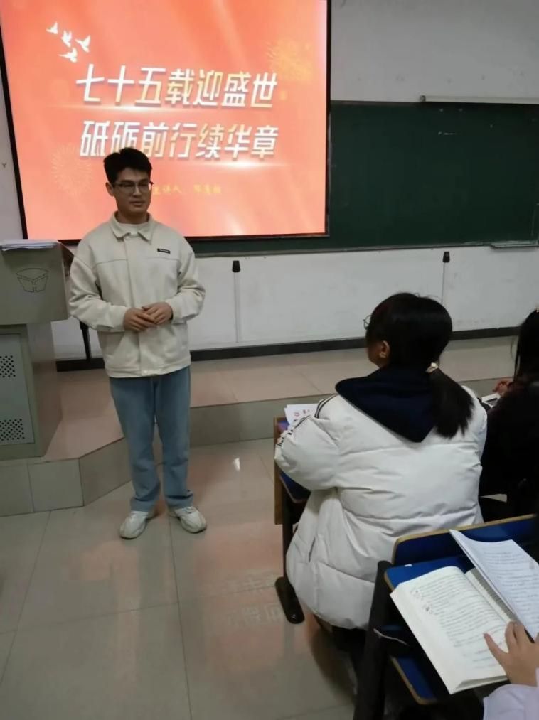邓老师开篇援引习近平总书记的讲话,带领大家回溯往昔七十五载岁月。华夏儿女在历史长河中不断奋斗,推动经济稳步增长,民主创新不断,文化繁荣发展,提升人民生活质量,使祖国焕发蓬勃生机。这一番深刻而真挚的讲述,深深触动并鼓舞着在场同学们的心弦,激励着同学们在未来继续并肩携手,为中华民族伟大复兴的中国梦全力以赴、砥砺奋进。