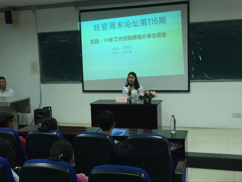 9月21日,经管周末论坛第116期主题为“10年工作历程感悟分享交流会”讲座于北区31栋举行,主讲人为03级人资员工龚艳华。