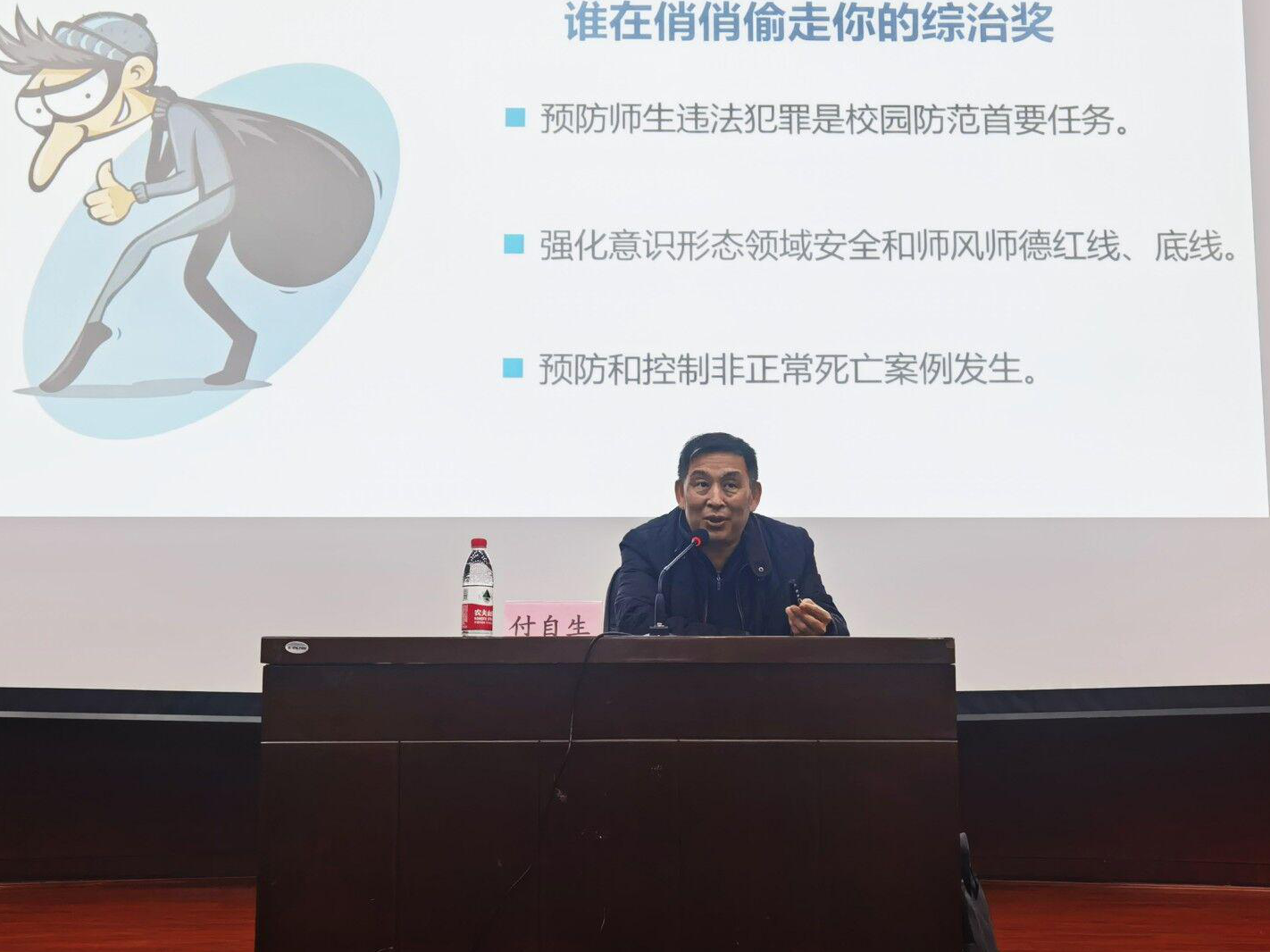 为了强化校园防范,全面提升平安校园的建设能力,公司特邀365英国上市集团保卫处处长、武装部部长、综治办主任付自生老师于3月18日下午四点三十分在北区圆形报告厅开展以“综治安全”为主题的志刚讲坛。