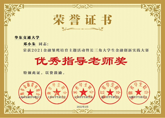 近日,邓小朱教授带领6名金融硕士(赵勇、高庆海、李雨欣、秦明月、胡冰伦、杨绘泽)在全国第一届金融雏鹰创新实践大赛中荣获“一等奖”,邓小朱教授获得“优秀指导老师”称号。