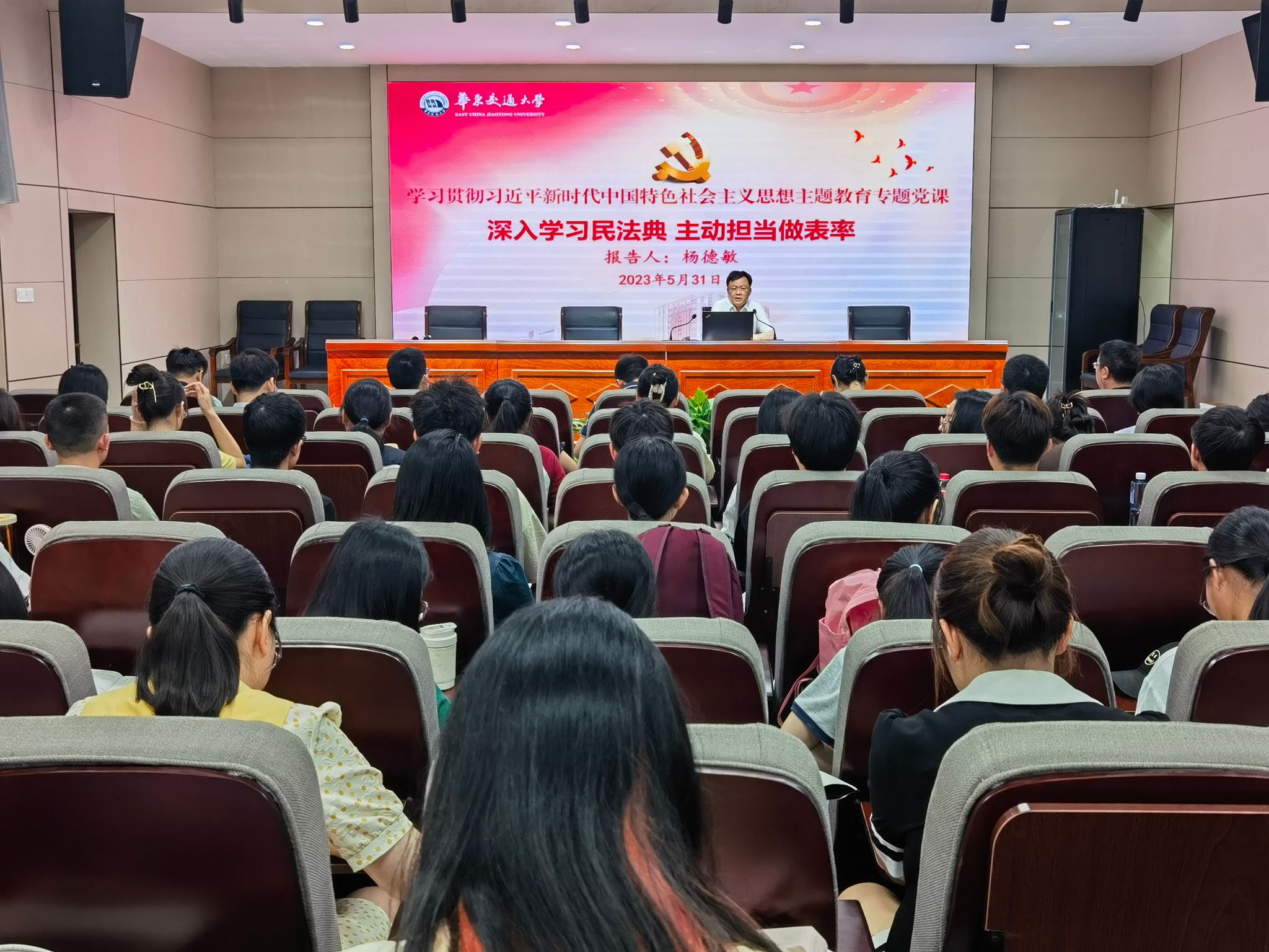 为深入开展学习贯彻习近平新时代中国特色社会主义思想主题教育,认真落实习近平总书记关于加强民法典学习宣传的重要指示精神。5月31日,公司党委委员、副董事长杨德敏教授以“深入学习民法典,主动担当作表率”为题,为公司统计与行政教工党支部讲授专题党课暨为2022级人力资源管理专业2、3班全体同学上思政课。